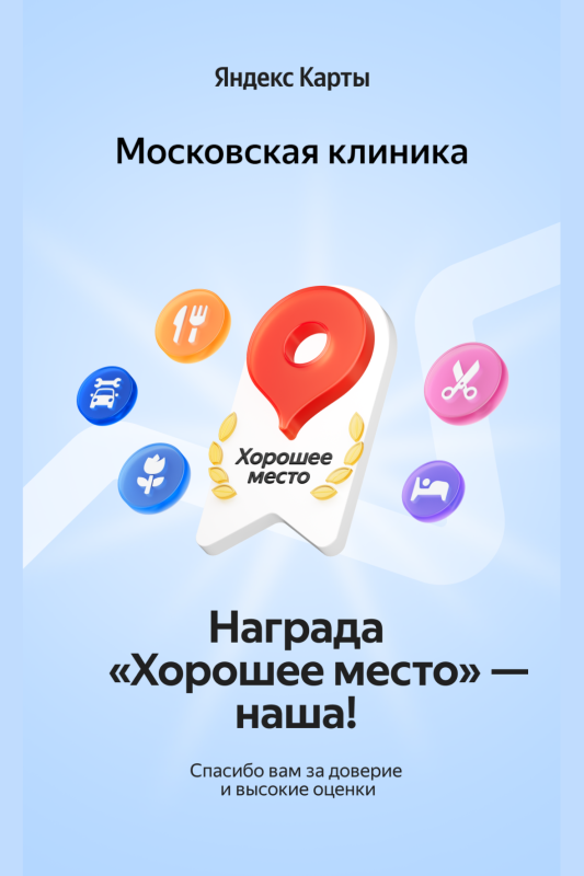 Мы удостоены премии «Хорошее место» за высокий уровень сервиса и положительные отзывы пациентов.