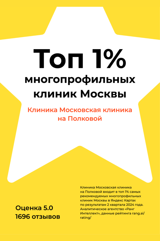 По итогам II квартала 2024 года аналитическое агентство «Ранг Интеллект» включило нас в 1% самых рекомендуемых многопрофильных клиник столицы. Это результат ваших отзывов и высокой оценки нашей работы.